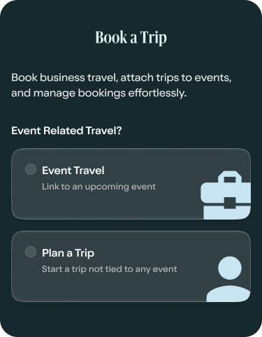 Search and book flights, hotels, trains, and car rentals directly from the app — all within your company's travel policy.
